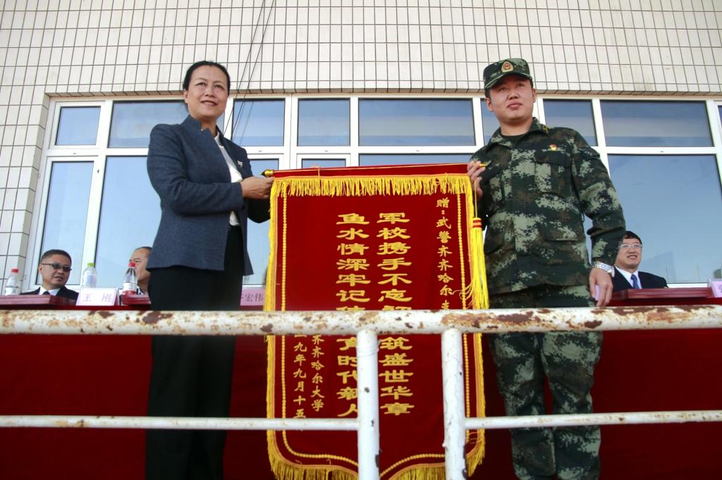 陳桂芝校長代表學校為承訓部隊——武警齊齊哈爾支隊贈送錦旗,感謝部隊全體軍訓教官的專業指導和艱辛付出,武警齊齊哈爾支隊政治部副主任張金龍代表承訓部隊接受錦旗。