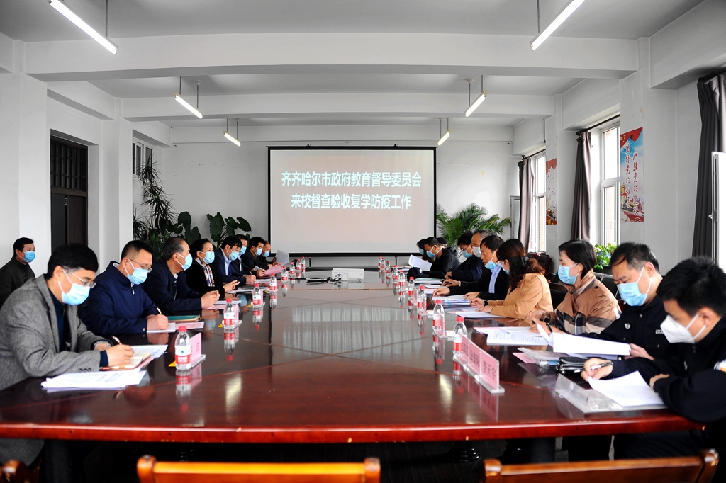5月25日上午,受省政府教育督導委員會委托,齊齊哈爾市政府副秘書長胡本全、市教育局三級調(diào)研員周立山以及市衛(wèi)健委、市場監(jiān)管局、市公安局等單位相關工作人員一行10人來到我校督查驗收復學防疫工作準備情況。校領導陳桂芝、張文治、王剛、李英杰、陶佰睿以及學校辦公室、學生工作部(學生處)、保衛(wèi)處、教務處、后勤管理處、研究生部等部門負責人陪同督查驗收。