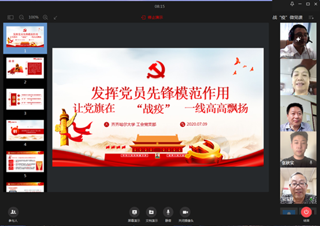 7月6日下午,校黨委常委、副校長李英杰通過釘釘會議直播的方式,以《不忘初心,牢記使命,堅決打贏疫情防控阻擊戰(zhàn)》為題,為教務處黨支部全體黨員上了一堂深刻的黨課。結合疫情防控常態(tài)化的新形勢和半年來教務處黨支部在抗擊疫情中的具體工作,他從明確什么是黨員的先鋒模范作用、戰(zhàn)“疫”新常態(tài)下對黨員先鋒模范作用的要求、戰(zhàn)“疫”新常態(tài)下如何發(fā)揮黨員先鋒模范作用三個方面進行了詳細闡述,并針對學校期末線上考核工作和2020年秋季學期開學準備工作提出了具體要求。李英杰強調,黨員干部要自覺提高政治站位,主動擔當,使疫情防控和教育教學工作兩不誤,要把初心寫在行動上,把使命落在崗位上,確保各項疫情防控工作落實落靠,確保在線教學和在線考核工作平穩(wěn)運行。