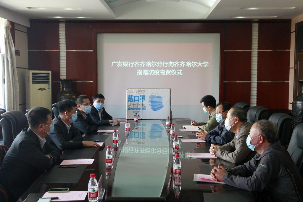 董玉庭代表學校向廣發銀行愛心助學的善舉表示感謝。他表示,在學校防疫工作面臨新挑戰和新考驗的關鍵時期,廣發銀行的愛心之舉,彰顯了企業的責任和擔當,為齊齊哈爾大學筑牢安全防線、打贏常態化疫情防控阻擊戰提供了有力的精神支持和物資保障。這份同舟共濟、眾志成城的大愛擔當,必能進一步凝聚起校企同心戰勝疫情的強大力量,同時也將推動未來校企合作結出更多更豐碩的成果。