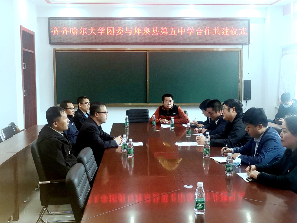 在拜泉縣第五中學,張文治參加了我校團委與拜泉五中的共建合作儀式。會上,張文治與拜泉五中校長及學校領導班子成員就黨建引領、人才培養、校園文化建設、支教幫扶、師資輸送、大學生志愿服務等校校合作事宜進行了座談,我校團委向拜泉五中捐贈了學生學習生活用品。