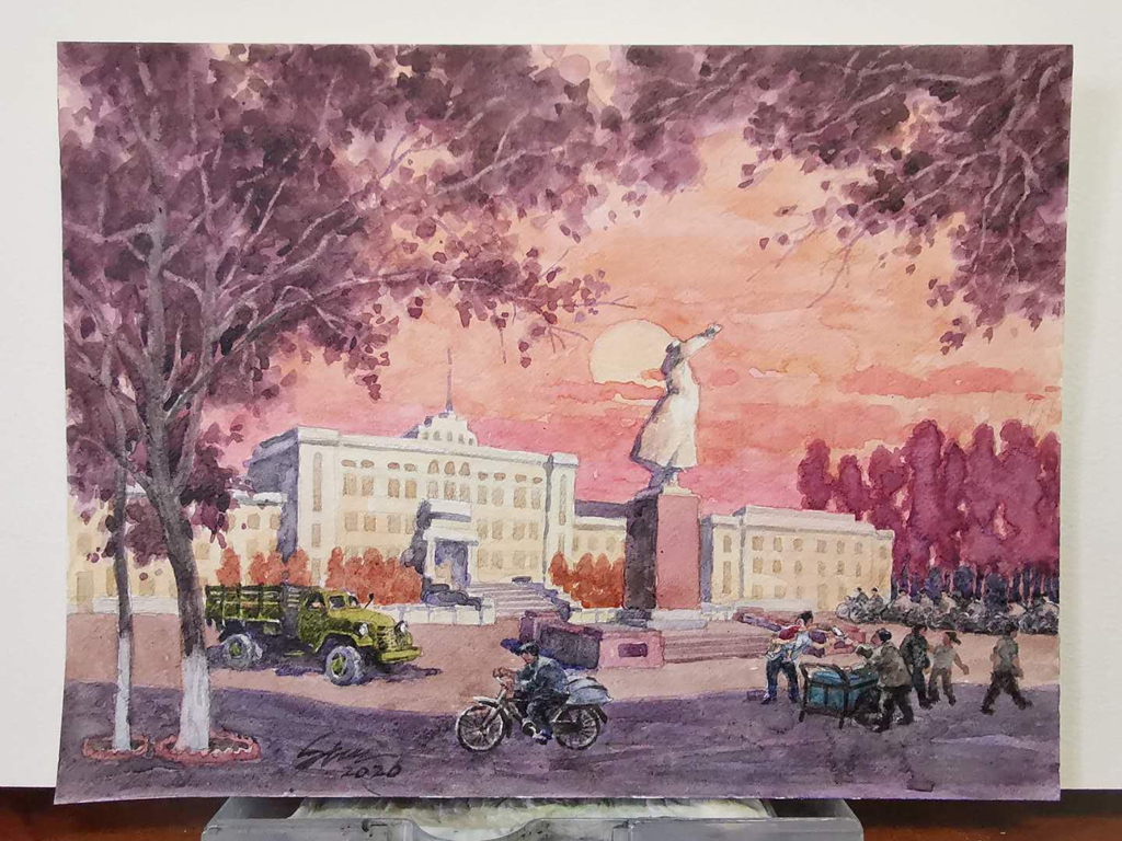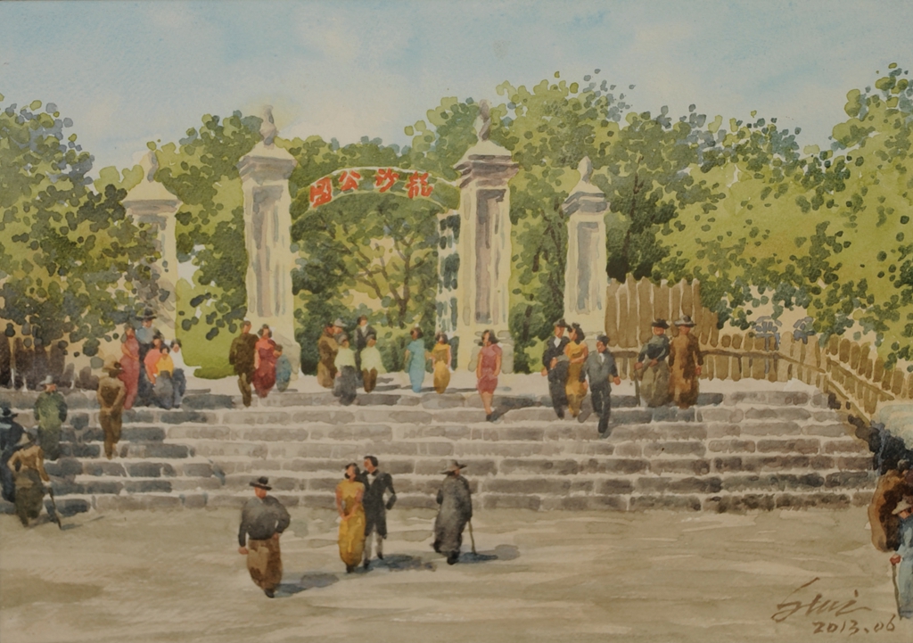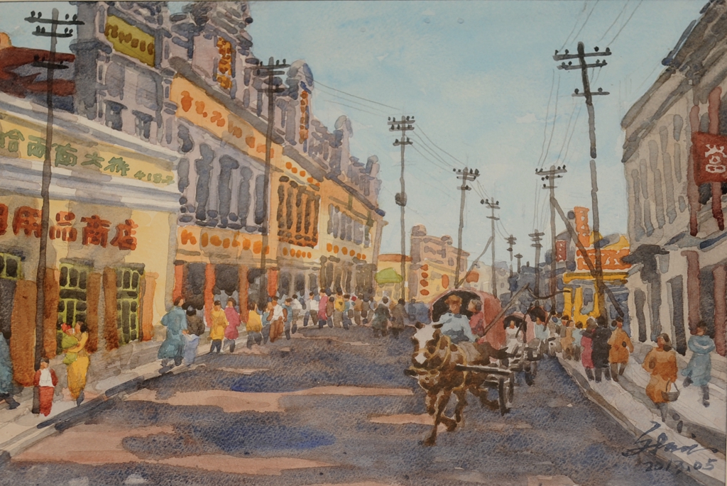 做為本土畫家的馬振慶教授,對齊齊哈爾市有著深厚的感情。他了解這座城市的歷史,切身感受著這座城市的發(fā)展,立足這片沃土,把對城市的熱愛與心中的情感付諸于筆端,揮筆潑彩。他以嫻熟的水彩畫技藝,創(chuàng)作了一批展現(xiàn)齊齊哈爾一九四九年前、一九四九年后和改革開放以來的三段歷史時期城市面貌變遷的畫作。在他的作品中,有的是借用城市老照片進行再創(chuàng)作,有的是自己進行采風的切身感受。在保存城市歷史原貌的基礎上,融入個人的情思,運用色彩“言物、言情、言意”等多重藝術語言,發(fā)揮水彩畫的水韻特色,藝術性地表達了齊齊哈爾這座城市的歷史變遷和發(fā)展變化。他的水彩畫,既寫實又頗具意象,寫實不離法國印象派的色彩美,意象融入中國傳統(tǒng)藝術“似與不似”之意境,這是他擷取自然到藝術創(chuàng)作的“移情”,是采自內(nèi)心的“抒發(fā)胸中逸氣”,給人以詩意般畫境。