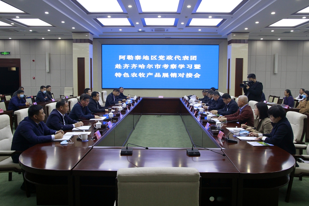 發(fā)布日期:2020-10-22 點(diǎn)擊量:10月21日,新疆阿勒泰地區(qū)黨政代表團(tuán)來齊考察學(xué)習(xí)暨特色農(nóng)牧產(chǎn)品展銷對(duì)接會(huì)在仙鶴賓館舉行。阿勒泰地委副書記、教育工委書記、宣傳部部長竇朝暉,齊齊哈爾市委常委、副市長吳煜等相關(guān)領(lǐng)導(dǎo)和企業(yè)代表出席會(huì)議。副校長張樹軍與我校相關(guān)人員應(yīng)邀出席會(huì)議。