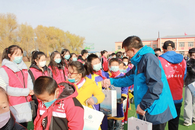 食品與生物工程學院黨委副書記馬金權講述了20年前牽手的小學生佟赟康結對的故事,鼓勵哈拉達族小學的孩子們要相信自己,為實現夢想,而努力學習,像佟赟康一樣,將來也上大學,有更大的本領和能力,去幫助需要幫助的人。