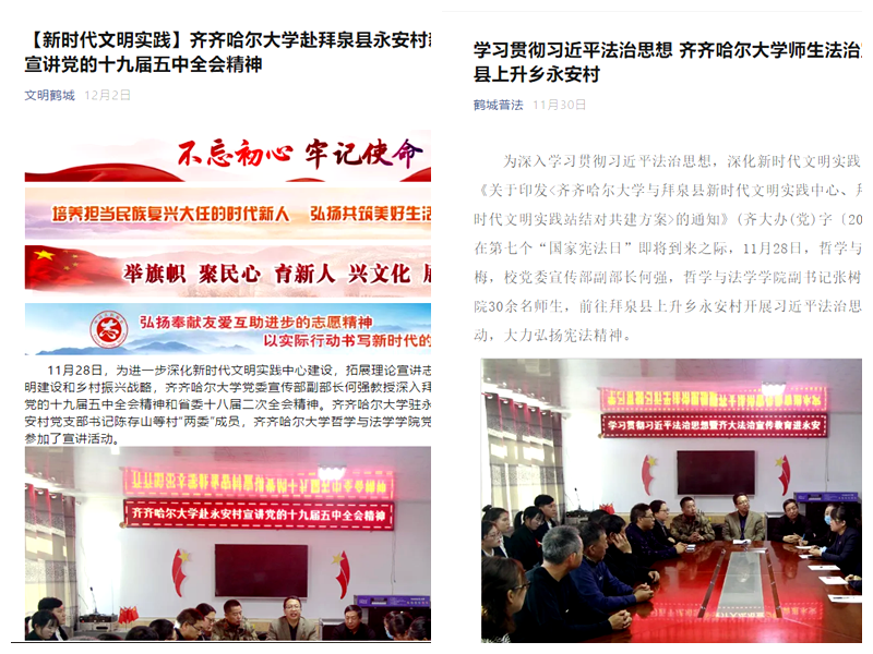 11月28日,為深入學習貫徹習近平法治思想,校宣傳部聯合哲學與法學學院赴結對共建的拜泉縣上升鄉永安村新時代文明實踐站,結合黨的十九屆五中全會精神宣講,開展了習近平法治思想宣傳、法律援助等活動,將法治宣傳陣地真正拓展到田間地頭,大力弘揚了憲法精神,進一步彰顯學校在地方法治宣傳工作中的輻射擔當。