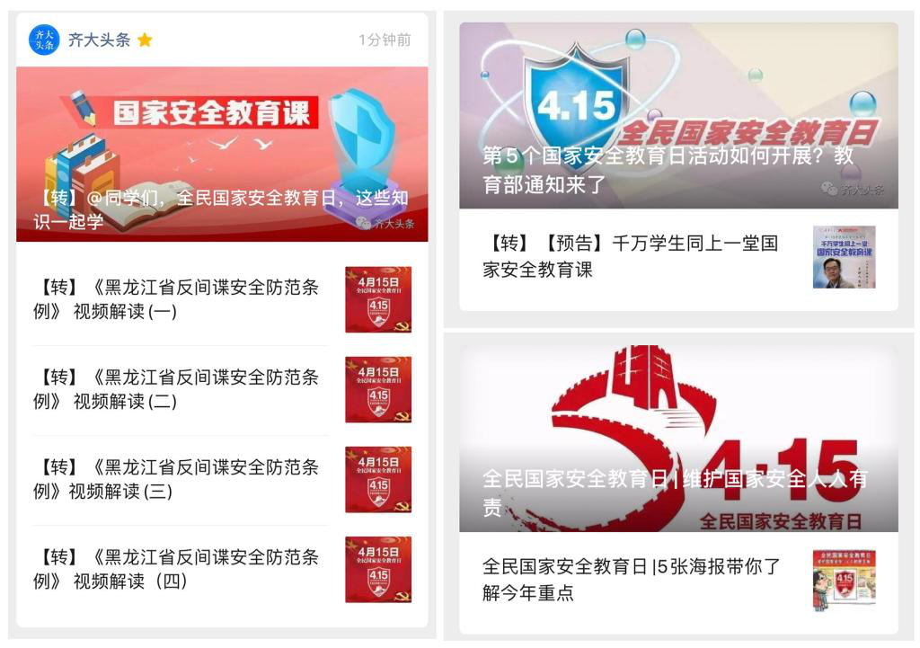學校高度重視全民國家安全教育日的宣傳教育工作,黨委宣傳部精心制定方案,豐富宣傳形式,加強宣傳報道,充分利用各種校園媒體,通過網站、微信公眾平臺、電子顯示屏等多種形式全方位開展宣傳教育活動,重點宣傳《中華人民共和國國家安全法》《中華人民共和國反間諜法》《中華人民共和國反恐怖主義法》《中華人民共和國網絡安全法》《中華人民共和國核安全法》《中華人民共和國保密法》等法律法規相關內容。在4月13日及時發布了《關于收看“安全日談安全”直播的通知》,要求各黨委、直屬黨支部組織師生收看國防大學教授、央視《百家講壇》主講人馬駿在“匯賢學堂”欄目所作的“安全日談安全”網絡視頻直播。大力宣傳總體國家安全觀,在校園積極營造濃厚宣傳環境,使廣大師生全員接受國家安全教育,為全民國家安全教育營造良好的輿論環境和社會氛圍。
