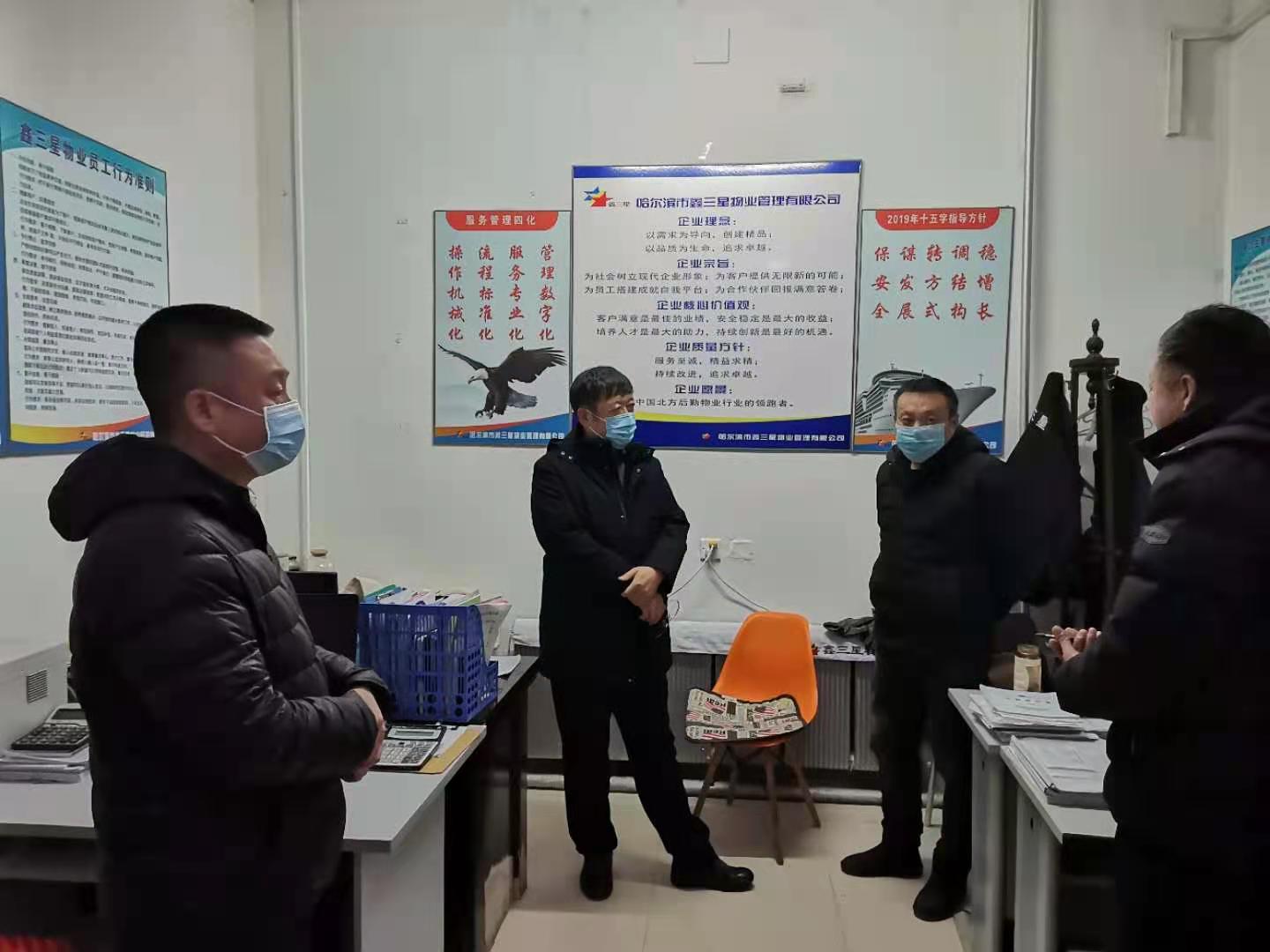 張文治一行還來到鑫三星物業公司辦公室走訪慰問,與項目經理等工作人員親切攀談,在認真聽取鑫三星物業公司相關負責人的工作匯報后,他肯定了物業公司近期的工作成績,要求物業公司加強門衛、更夫的培訓管理工作,嚴格測溫掃碼進公寓等程序,堅決外賣杜絕送餐到寢室等行為。并鼓勵物業公司盡心做好師生服務工作,實現多方共贏,為學校提供更優質服務。