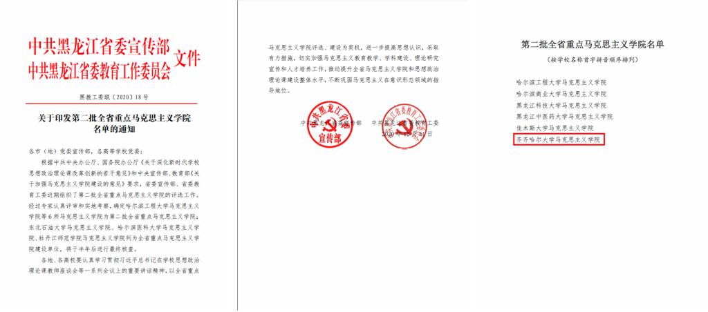 近日,省委宣傳部、省委教育工委聯(lián)合發(fā)文公布了第二批全省重點(diǎn)馬克思主義學(xué)院名單,齊齊哈爾大學(xué)馬克思主義學(xué)院成功入選,目前全省共有10所高校的馬克思主義學(xué)院被確定為全省重點(diǎn)馬克思主義學(xué)院。