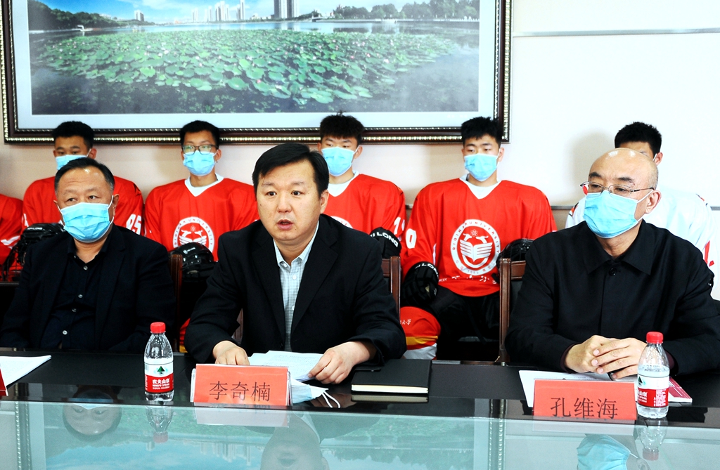 李奇楠在講話時(shí)代表學(xué)校對各位嘉賓的到來表示熱烈歡迎,對齊齊哈爾市杭奧電梯有限公司贊助我校冰球隊(duì)表示衷心的感謝,對齊齊哈爾大學(xué)“杭奧電梯”男子冰球隊(duì)成立表示熱烈的祝賀,并對我校的基本概況、學(xué)科專業(yè)設(shè)置、冰雪體育教育等情況進(jìn)行了介紹。他指出,學(xué)校作為冰雪體育科技聯(lián)盟理事單位和齊齊哈爾市社會科學(xué)冰雪研究基地,始終堅(jiān)持發(fā)展冰雪體育運(yùn)動,引領(lǐng)區(qū)域體育風(fēng)尚。我們將以此次“杭奧電梯”男子冰球隊(duì)成立為契機(jī),著力深化產(chǎn)學(xué)研協(xié)同合作,從配套政策、經(jīng)費(fèi)投入、科研條件、人才培養(yǎng)等方面全力支持,促進(jìn)政校企全方位、多層次、寬領(lǐng)域的交流合作,希望我們未來的合作將結(jié)出更加豐碩的成果,共創(chuàng)齊齊哈爾市杭奧電梯有限公司和齊齊哈爾大學(xué)更加美好的明天。