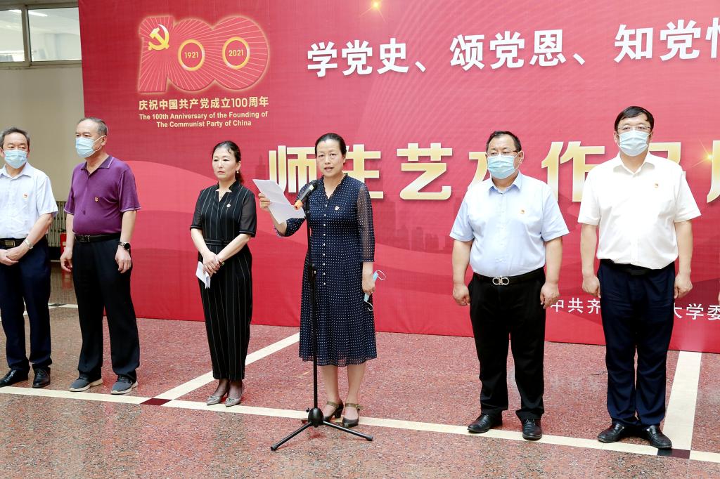 校黨委書記陳桂芝在開幕式上致辭,她代表學校黨委、代表學校黨史學習教育領導小組對展覽開幕表示熱烈地祝賀!向辛勤籌備展覽、精心創作的師生表示誠摯地慰問!