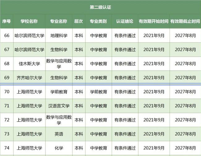 2021年9月30日,教育部辦公廳發布了2021年通過普通高等學校師范類專業認證專業名單,我校生物科學專業通過教育部師范類專業二級認證,認證結論有效期六年(2021年9月——2027年8月),成為黑龍江省首批通過師范類專業認證的高校。
