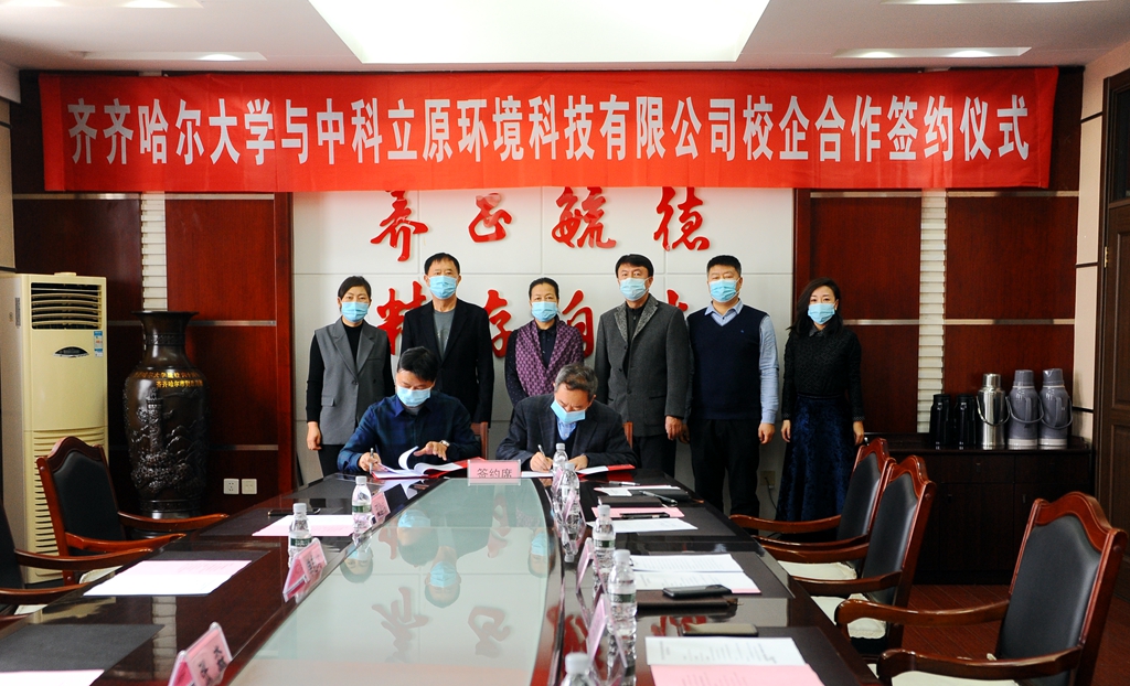 呂厚均與翟建偉代表校企雙方簽訂了《齊齊哈爾大學與中科立原環境科技有限公司校企戰略合作協議》及《養豬廢液微生物轉化中試工藝與設備》技術開發合同。