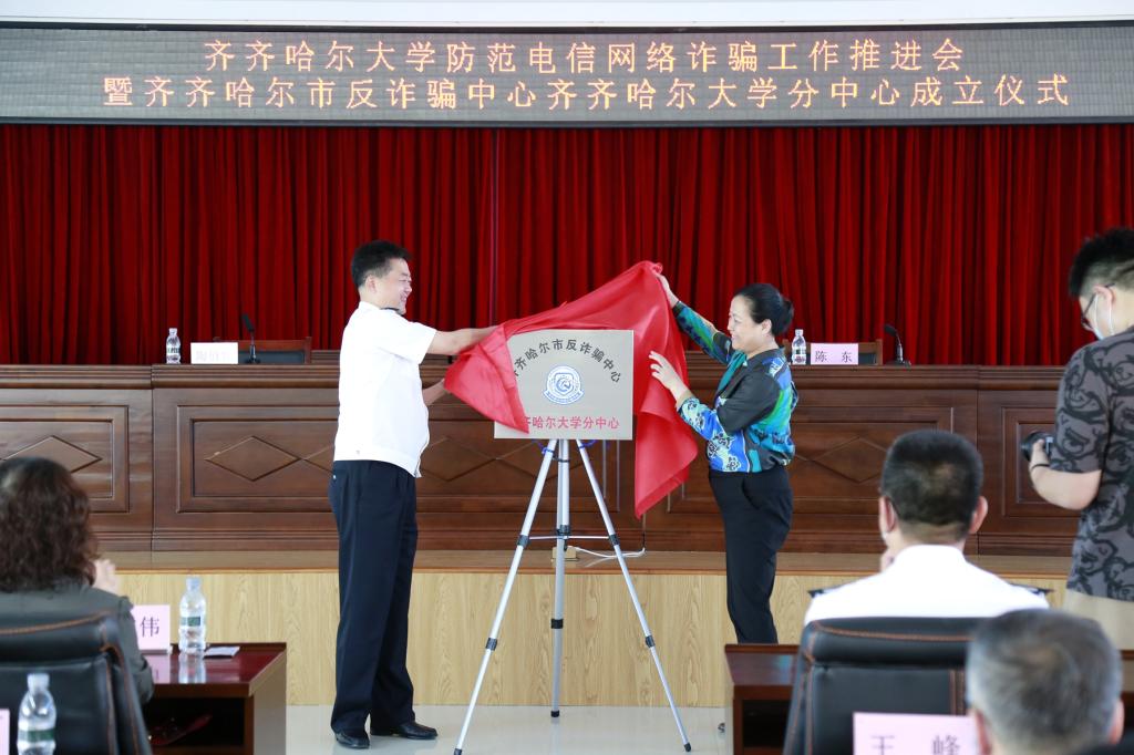 校黨委書(shū)記陳桂芝與副市長(zhǎng)陳東分別代表校地雙方在成立儀式上共同為齊齊哈爾市反詐騙中心齊齊哈爾大學(xué)分中心揭牌。