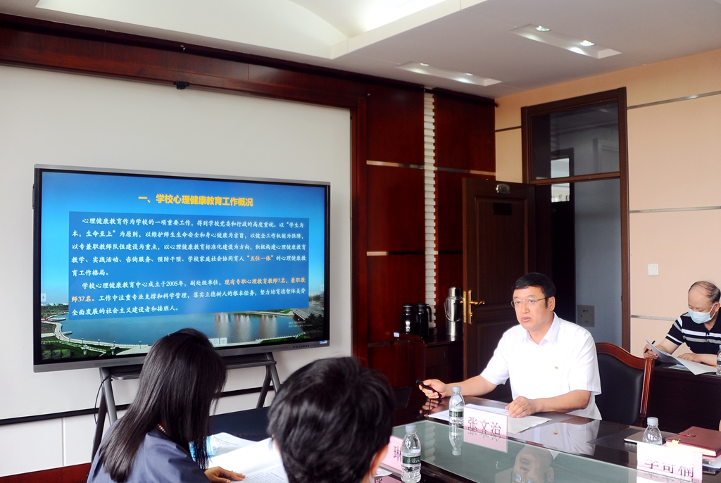 張文治代表學校向專家組匯報了學校心理健康教育工作概況、工作體制機制、工作隊伍保障、工作條件保障、教育教學體系、實踐活動體系、咨詢服務體系、預防干預體系、協同育人體系、示范效應和工作特色亮點等內容。