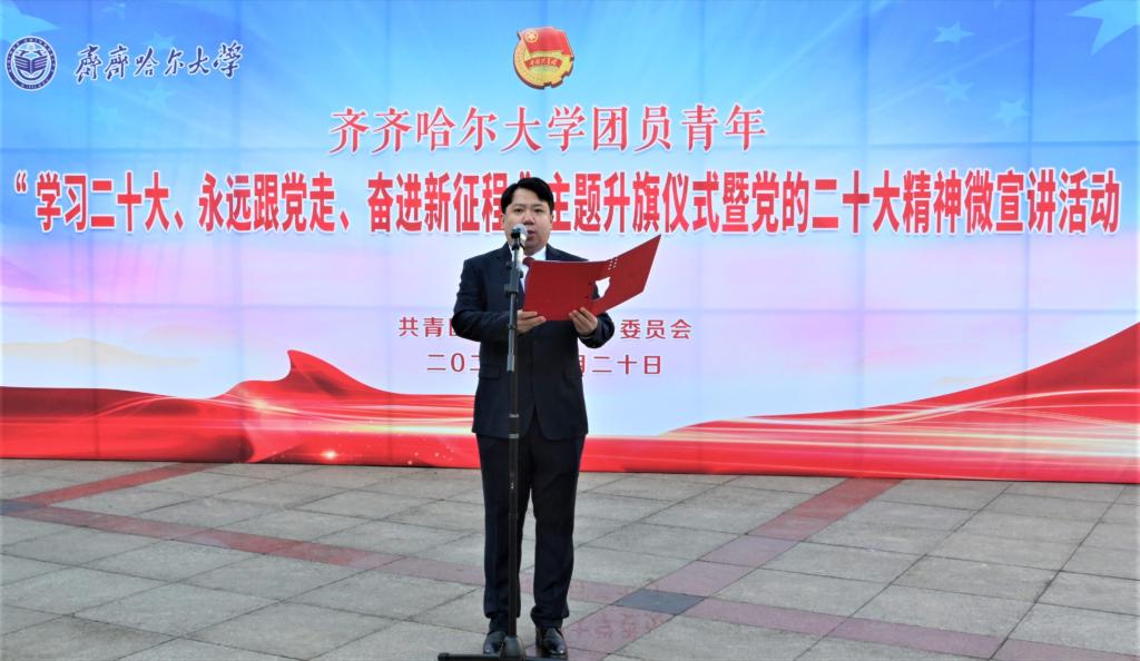 青春聚力啟新程,團結奮斗向復興。3月20日上午7時,我校在中區廣場舉行團員青年“學習二十大、永遠跟黨走、奮進新征程”主題升旗儀式暨黨的二十大精神微宣講活動。校黨委副書記張文治出席活動,各學院、研究生部主管學生工作領導、團委書記、團委副書記、團員青年代表參加了此次活動。活動由校團委副書記馬小華主持。