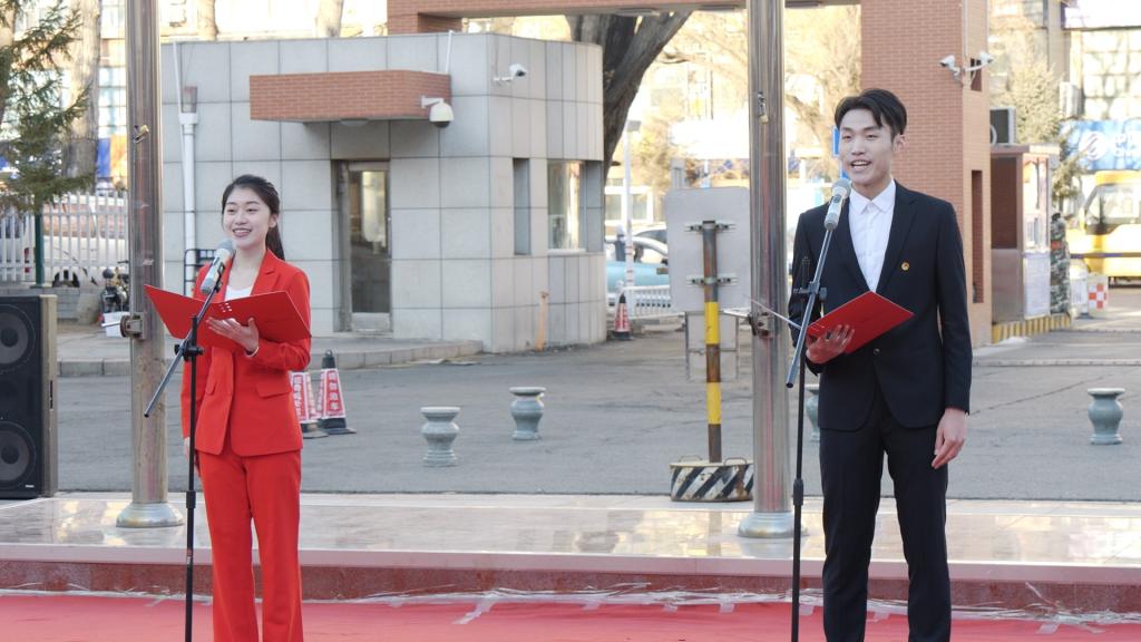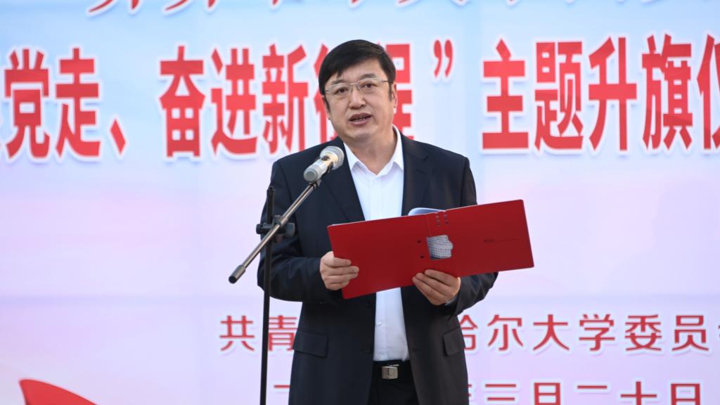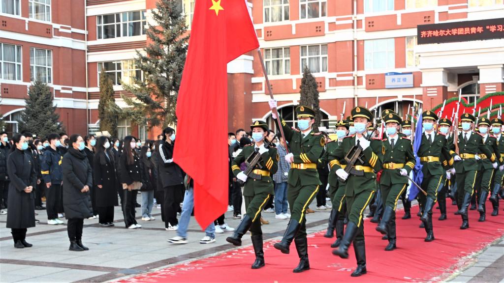 上午7時,活動正式開始。學校國旗護衛隊以整齊劃一的步伐,昂首闊步護衛國旗、校旗走向升旗臺。伴隨著雄壯的《義勇軍進行曲》,鮮艷的五星紅旗冉冉升起、熠熠生輝。伴隨著學校校歌《我們是自豪的齊大人》,齊齊哈爾大學校旗徐徐升起、迎風舒展。