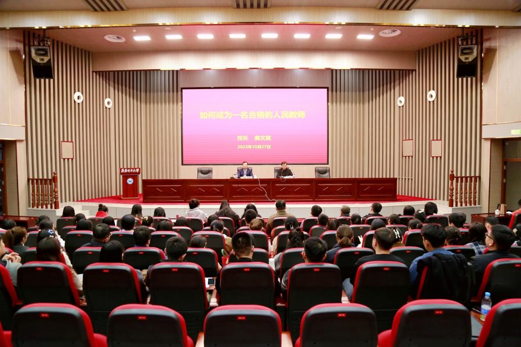 發布日期:2023-10-28 點擊量:10月27日下午,2023年新進教師入職培訓第一講在學校日新大廈四樓報告廳舉行。校長郝文斌以“如何成為一名合格的人民教師”為題為新入職教師做講座。2023年全體新入職教師參加了培訓,培訓由副校長李奇楠主持。