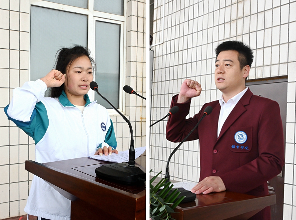 運動員代表、學校第二十二屆田徑運動會十佳運動員、理學院數學與應用數學(師范類)專業王曉婷同學代表全體運動員宣誓,裁判員代表、體育學院教師馬正輝代表全體裁判員宣誓。
