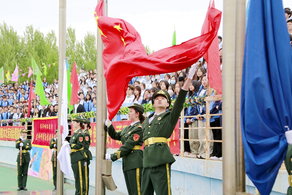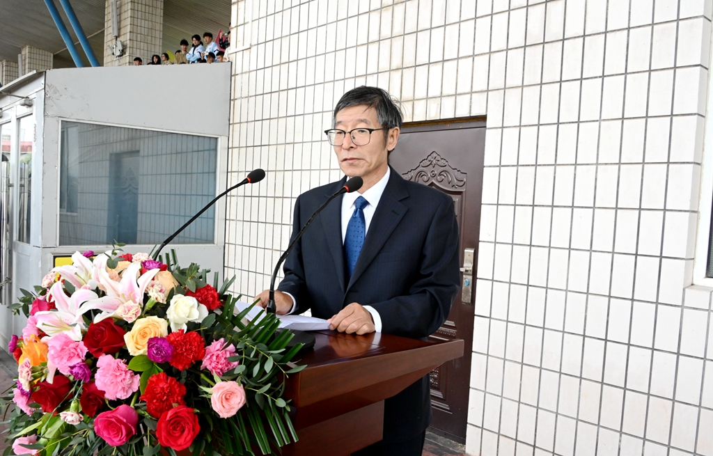 在莊嚴的升旗儀式結束后,校長郝文斌在大會上致開幕辭。他代表學校向全體師生、向參賽運動員致以親切的問候!向為本屆運動會籌備和召開辛勤付出的裁判員、大會工作人員致以誠摯的敬意!
