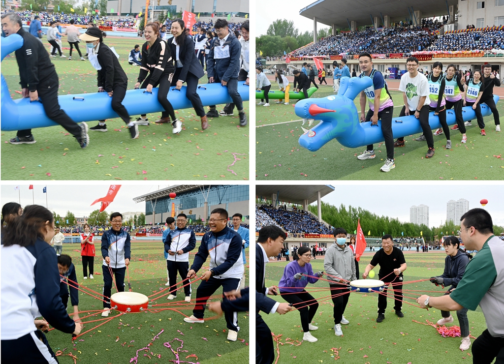 開幕式結束后,校工會舉行了“旱地龍舟”“同心鼓”教工集體趣味運動項目,各分工會參賽隊員奮勇爭先、頑強拼搏,現場氣氛緊張又激烈,展現了我校教職工自信自強、團結互助、奮發進取的精神面貌。