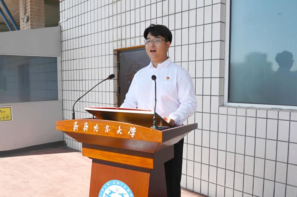 在校生代表、校學生會執行主席、哲學與法學學院哲學211班孔繁碩同學發言。他結合在齊大學習和生活經歷,與2024級的新生分享了感悟,他真誠感謝學校老師給予的諄諄教導,感謝學校營造的濃郁學習氛圍,他深深體會到了知識的魅力和個人成長的快樂。