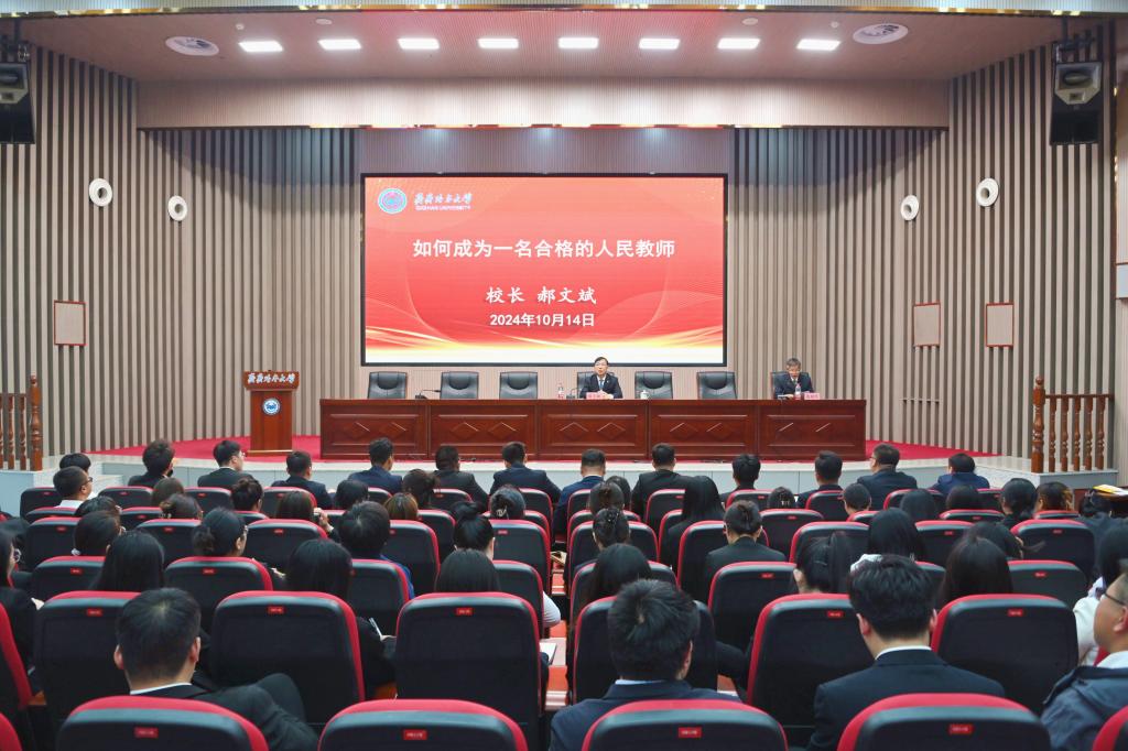 郝文斌強調,青年教師要從齊齊哈爾大學七十余年的發展歷史中汲取從教、樂教、奮進的力量。他指出,齊齊哈爾大學是一所底蘊深厚、實力強勁、特色鮮明、充滿潛力和飽含情懷的大學。我校地處祖國邊疆,扎根龍江大地辦大學。青年教師要傳承和發揚“萌芽精神”,踐行學校“養正毓德、精存自生”的校訓精神,厚植愛黨、愛國、愛校情懷,在立德樹人中成就人生理想。郝文斌指出青年教師要牢固樹立終身學習的理念,探求真理、勇于創新,要關注教育領域的發展動態,不斷提升自己的專業素養,主動適應時代的發展和變化。郝文斌結合自身成長經歷為青年教師如何盡快完成角色轉變,更好適應教育教學工作指出了路徑方法,一是要經受住政治關的考驗,成為引領成長、培育新人的育人模范;二是要經受住師德關考驗,成為爭當楷模、以身作則的師者表率;三是要經受住教學關考驗,成為勤奮篤行、盡心治學的教學能手;四是要經受住科研關的考驗,成為刻苦鉆研、勇于創新的科研骨干;五是要經受住職稱關考驗,成為勤奮進取、追求卓越的優秀教師。