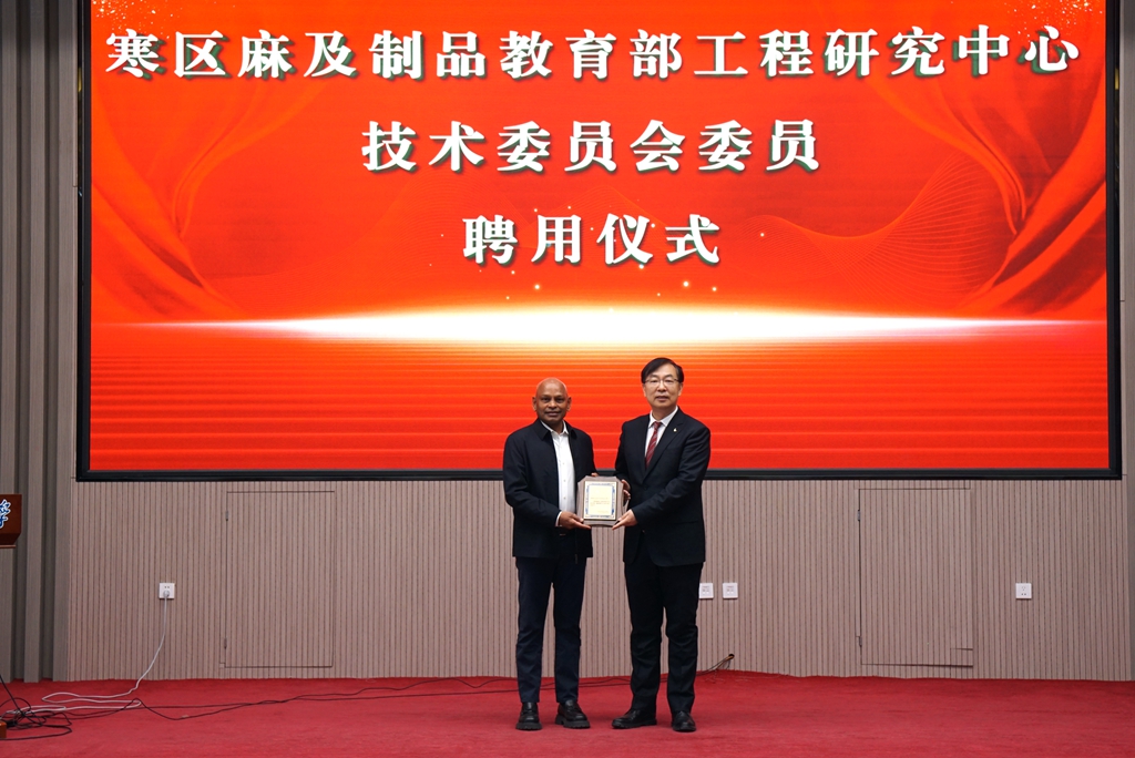 在聘任儀式上,校長郝文斌代表學校發表致辭,并為西拉姆院士頒發聘任證書。他表示,西拉姆院士的受聘不僅為寒區麻及制品教育部工程研究中心注入了國際化的學術視野,也將在新型紡織材料的功能化開發、先進制造工藝的優化及可持續技術的應用等方面提供強有力的學術支撐。依托西拉姆院士的前沿學術理念和豐富科研經驗,寒區麻及制品教育部工程研究中心將在科研能力提升、學科建設優化及產學研合作深化等方面持續探索,積極推動跨學科融合,拓展新型紡織材料的研究方向。同時,寒區麻及制品教育部工程研究中心將加強科技創新,推動關鍵技術的發展與應用,促進創新成果的高效轉化,不斷提升學校在相關領域的學術影響力和技術創新能力,為學科建設和行業發展作出更大貢獻。