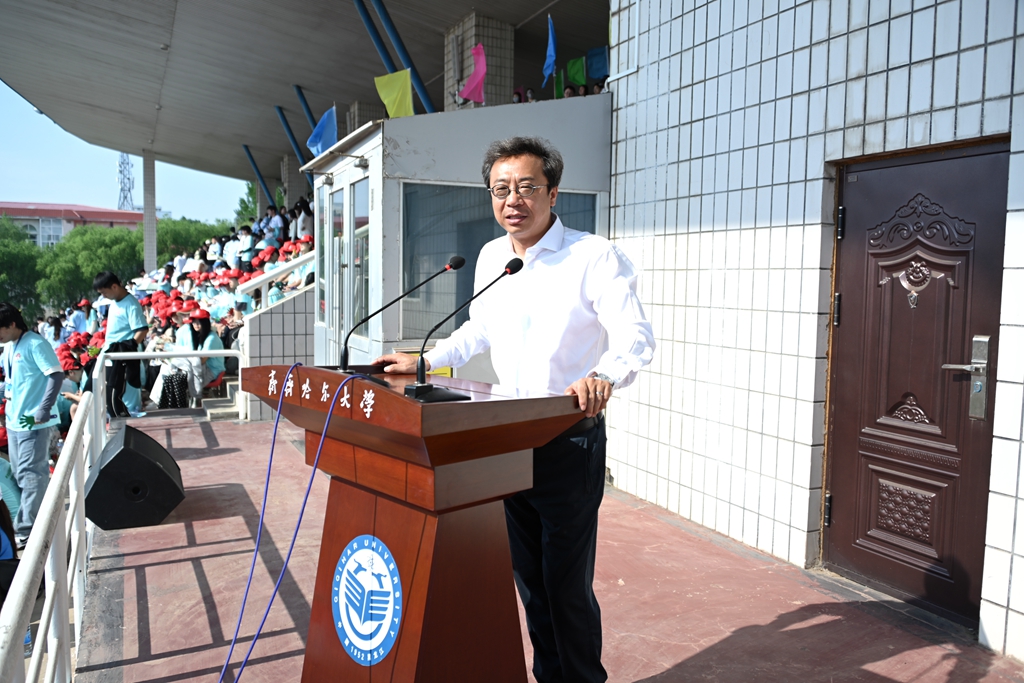 副校長范鐵明在致辭時表示,本屆田徑運動會是一次凝聚人心、振奮精神的盛會,更是一堂生動的“立德樹人”實踐課。在團結奮進、積極向上的體育競技氛圍中,全體運動員奮勇爭先、努力拼搏,取得了運動成績和精神文明雙豐收。希望全校師生員工積極助力學校“體教”深度融合,用體育運動之美展現砥礪奮進、昂揚向上的齊大人精神風貌,以更加強健的體魄、更加飽滿的熱情、更加昂揚的斗志,為推動學校改革發展匯聚強大合力,奮力書寫學校高質量發展新篇章!(點擊觀看第二十四屆田徑運動會精彩瞬間)