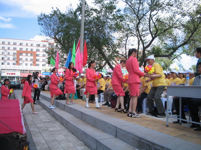 新老交流中薪火相傳。參加此次廣場文藝演出的離退休黨員100余名,其中年齡最高者已達82歲;部分老黨員曾親身參加過抗日戰爭、解放戰爭和抗美援朝戰爭,為國家的獨立、人民的解放和世界的和平建立了功勛;在和平建設時期,他們又為學校的創建、改革與發展做出了貢獻。在文藝演出前。人文學院的學生代表為他們敬獻了鮮 花,表達了當代大學生對老一輩革命者的崇高敬意;離退休老黨員劉吉平也在演出中寄語青年學子要“努力學習,創出佳績,為學校、為家庭爭光!”,表達了老一輩對青年大學生的殷切希望。