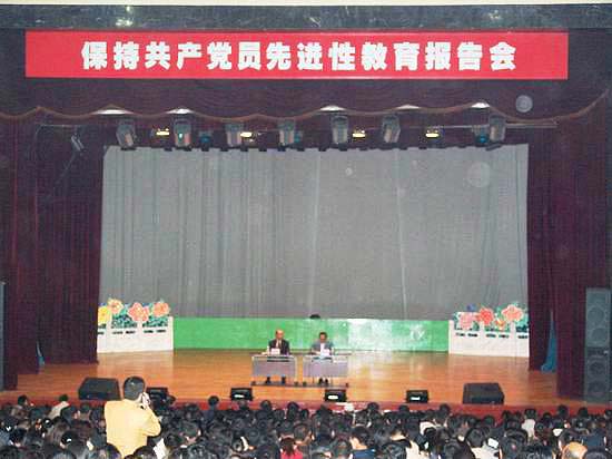 根據(jù)我校《保持共產(chǎn)黨員先進性教育活動集中學習教育實施方案》安排,9月21日下午,在中區(qū)俱樂部召開全校黨員大會,集中聽取市委保持共產(chǎn)黨員先進性教育督導組組長龍志遠作的《全面深入學習“三個代表”重要思想,做實踐“三個代表”的模范》專題報告。校黨委書記陳承貴、校長唱江華、黨委副書記史鐵成、王鳳琴、紀委書記張學軍、副校長曲偉建、姜守訓、張忠恒、鄭喜群、鄧啟剛、工會主席呂曉輝以及市委保持共產(chǎn)黨員先進性教育督導組成員出席了大會,全校教工、學生和離退休黨員參加了大會。會議由校黨委書記陳承貴主持。