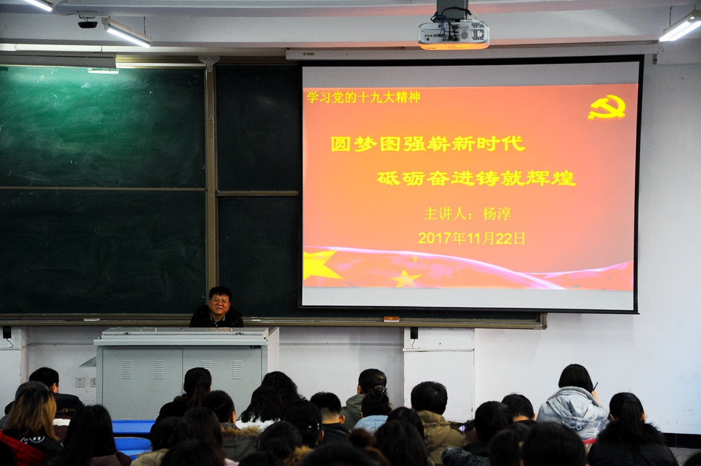 在中區11教階梯202教室,校黨的十九大精神宣講團成員、食品與生物工程學院黨委書記楊淳副教授以《圓夢圖強嶄新時代  砥礪奮進鑄就輝煌》為題,詳細介紹了黨的十八大以來我國經濟、政治、文化、社會、生態文明建設等方面取得的巨大成就,突出強調了反腐、精準扶貧、國防和軍隊改革是人民群眾最關注、最吸引眼球的三大亮點。他指出,黨的十八大以來的五年,以習近平同志為核心的黨中央高舉中國特色社會主義偉大旗幟,準確把握中國經濟發展所處歷史新方位,團結和帶領全國人民為實現中華民族偉大復興中國夢而努力奮斗、砥礪奮進,取得了舉世矚目的偉大成就。解決了許多長期想解決而沒有解決的難題,辦成了許多過去想辦而沒有辦成的大事。輕工與紡織學院全體教職工、學生黨員及入黨積極分子參加了宣講活動。