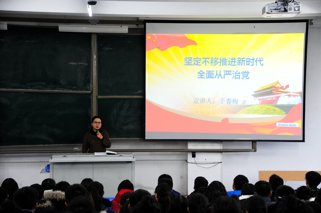 在中區11教階梯302教室,校黨的十九大精神宣講團成員、馬克思主義學院副院長、碩士生導師于春梅教授以《堅定不移推進新時代全面從嚴治黨》為題,從充分認識五年來全面從嚴治黨的重大成就、明確新時代全面從嚴治黨的總體要求、全面把握黨的十九大對新時代全面從嚴治黨的新部署等方面,對黨的十九大精神進行了系統、全面、深入的講解。于春梅指出,中國特色社會主義進入新時代,面臨新環境新挑戰新問題,打鐵必須自身硬,因此必須堅定不移推進新時代全面從嚴治黨這一偉大工程,必須進一步把我們黨建設好、建設強,使我們黨成為堅強有力的領導力量,從而決勝全面建成小康社會、奪取新時代中國特色社會主義偉大勝利。機關黨委全體教職工參加了宣講活動,化學與化學工程學院全體教職工、學生黨員及入黨積極分子參加了宣講活動。