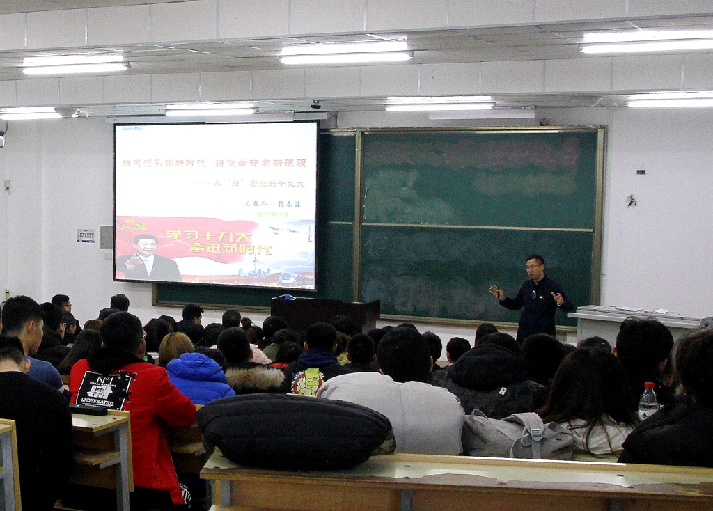 在西區1教階梯203教室,校黨的十九大精神宣講團成員、馬克思主義學院中國近現代史綱要教研部主任、碩士生導師張春波副教授以《新思想引領新時代 新使命開啟新征程》為題,從新時代、新矛盾——進行偉大斗爭,新理論、新思想——建設偉大工程,新任務、新舉措——推進偉大事業,新使命、新征程——實現偉大夢想等四個方面闡釋了黨的十九大的“新”。他指出,只有進行新的偉大斗爭才能開創新時代,解決新矛盾。只有以馬克思主義中國化最新成果——習近平新時代中國特色社會主義思想為行動指南,才能建設新的偉大工程。他分析了推進中國特色社會主義偉大事業的新任務和新舉措,提出在實現中華民族偉大復興中國夢的新征程中廣大師生的使命擔當。理學院、應用技術學院全體教職工、學生黨員及入黨積極分子參加了宣講活動。