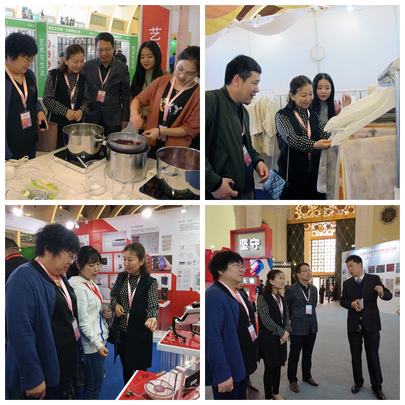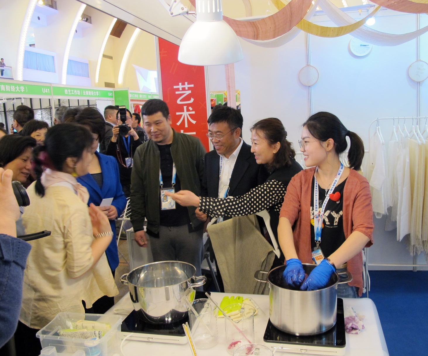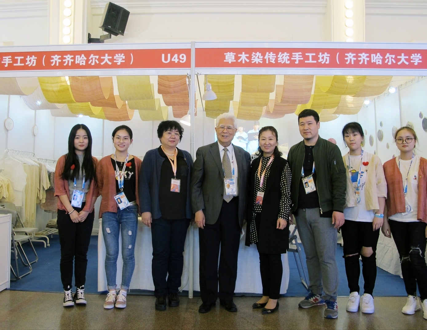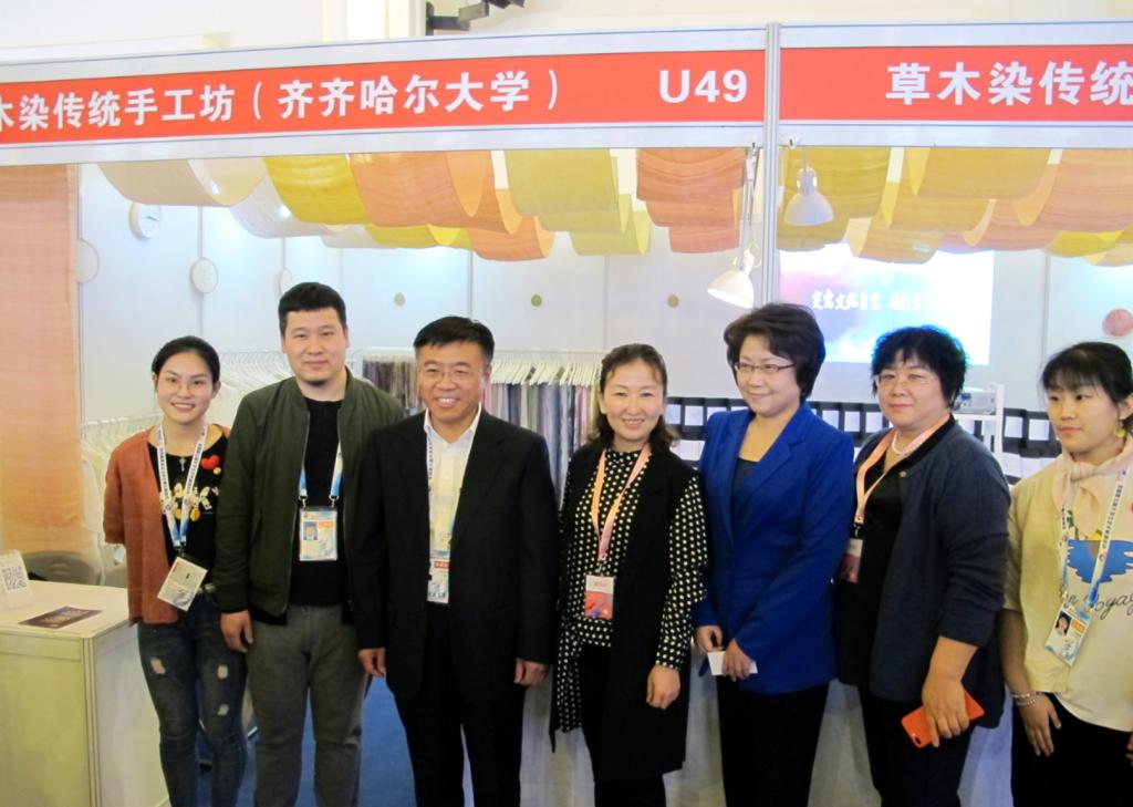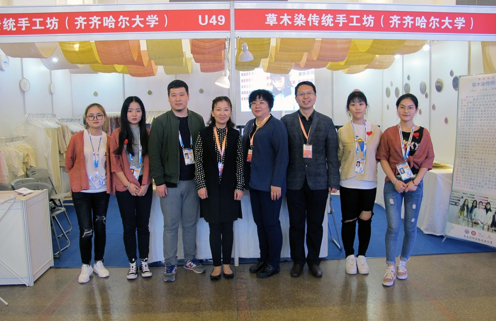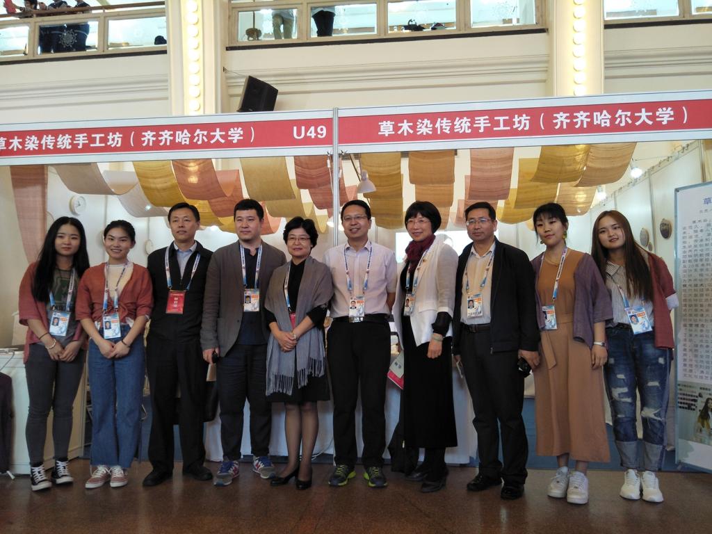 草木染傳統工作坊是在“文化鑄校”科學理念指導下我校大學生研發創新團隊于2012年建立的。該團隊主要由齊齊哈爾大學美術與藝術設計學院副院長范鐵明教授、服裝與服飾設計系趙志軍副教授等組成,團隊多年來以中國傳統染色技藝為基礎,利用現代科技手段進行技術改良和創新。通過建立大數據標準色卡數據庫系統,對紡織品的顏色特征進行大膽的藝術創新實踐。以全產業鏈整合連鎖、生物酶高效生化色素萃取、大數據標準色卡數據庫系統、分子生物學復合改性與表征、傳統技藝現代仿真為創新點,在天然染料方面為消費者提供安全環保的紡織物。通過多年的技藝革新與大量的創新實踐,目前已經形成了成熟的草木染技藝。2017年6月,草木染團隊參加第十五屆“挑戰杯”黑龍江省大學生課外學術科技作品競賽決賽,榮獲一等獎、最具市場潛力獎、最佳人氣作品獎三個獎項。2017年8月,該團隊獲得黑龍江省第五屆大學生藝術展演(藝術工作坊)二等獎。同年5月和8月,草木染研發創新團隊先后參加深圳文博會和第十二屆黑龍江國際文化產業博覽會,并順利與企業簽約進行全產業鏈合作。此次借助大藝展的平臺,我校的草木染傳統手工坊進一步走出黑龍江省,走向了全國,讓更多的人熟悉和喜愛,所有參演師生都充滿欣喜,倍感振奮。而欣喜與振奮之余,通過與全國各參展單位的交流,參演師生有了更多更深的思考,就是在新時代如何將草木染的成果更快更好地與現實生活緊密結合,不斷滿足日益增長的美好生活需要。更新發展理念,開拓審美視野,增長技藝見識,擴大友好交流,此次大藝展使齊齊哈爾大學參展師生收獲頗豐。