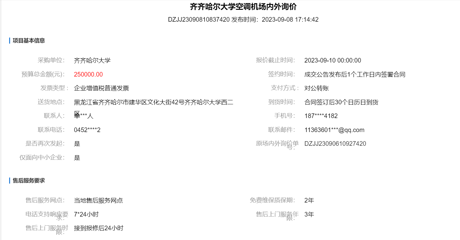 上一條:齊齊哈爾大學空調機場內外詢價(二次結果)(轉自黑龍江省政府采購網)