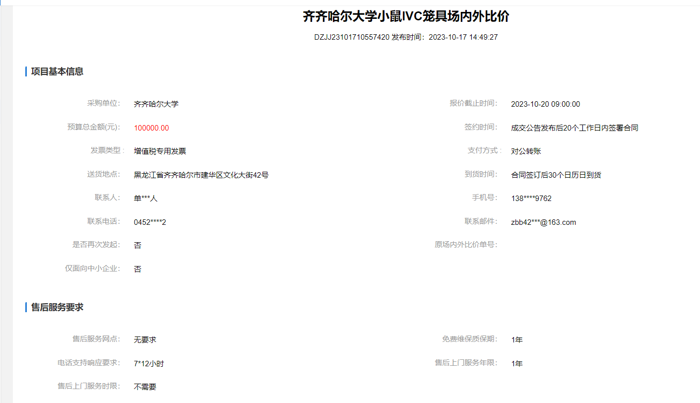 下一條:齊齊哈爾大學小鼠IVC籠具場內外詢價(二次廢標)(轉自黑龍江省政府采購網)