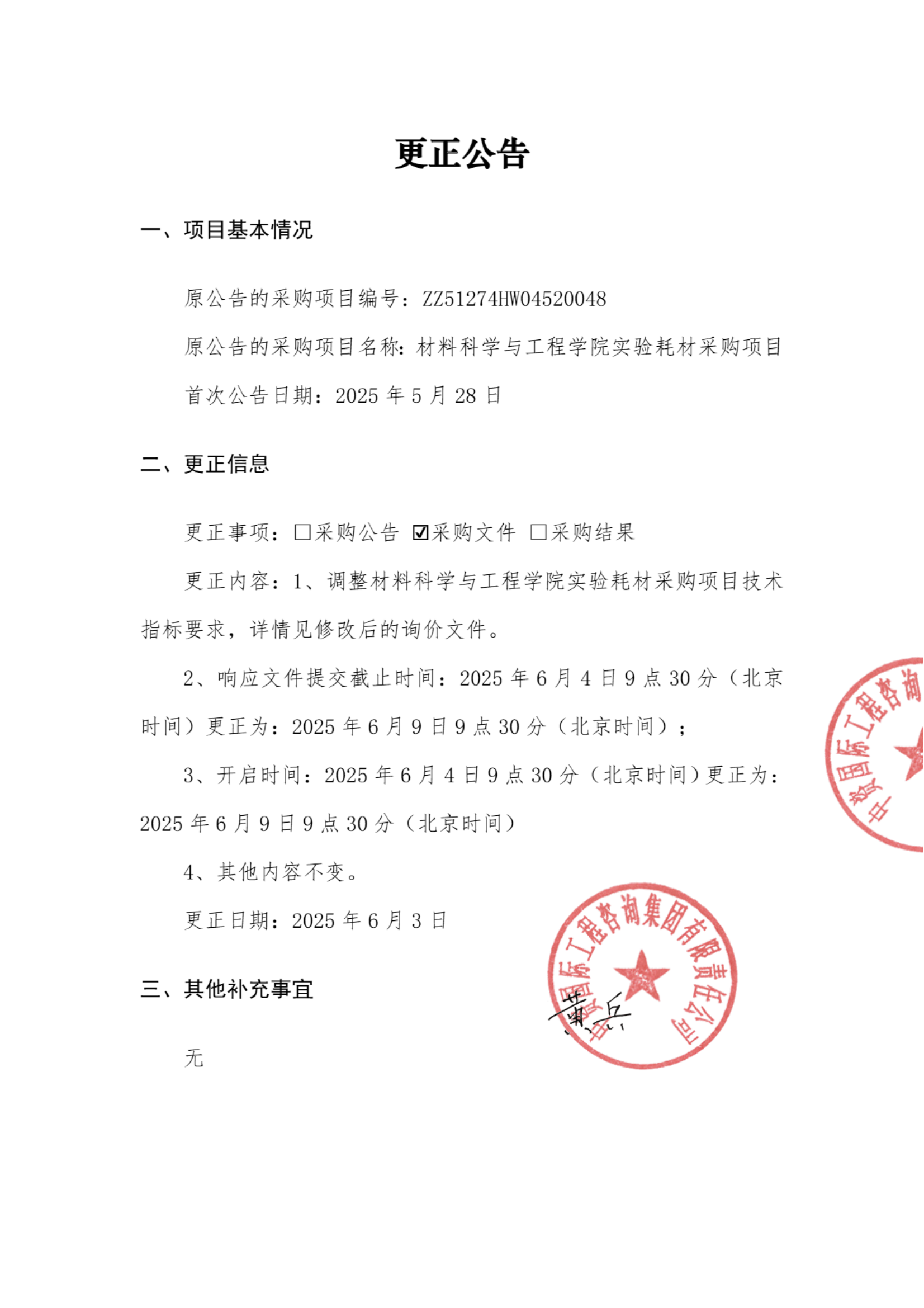 材料科學與工程學院實驗耗材采購項目-更正公告(轉自中國招標投標公共服務平臺)