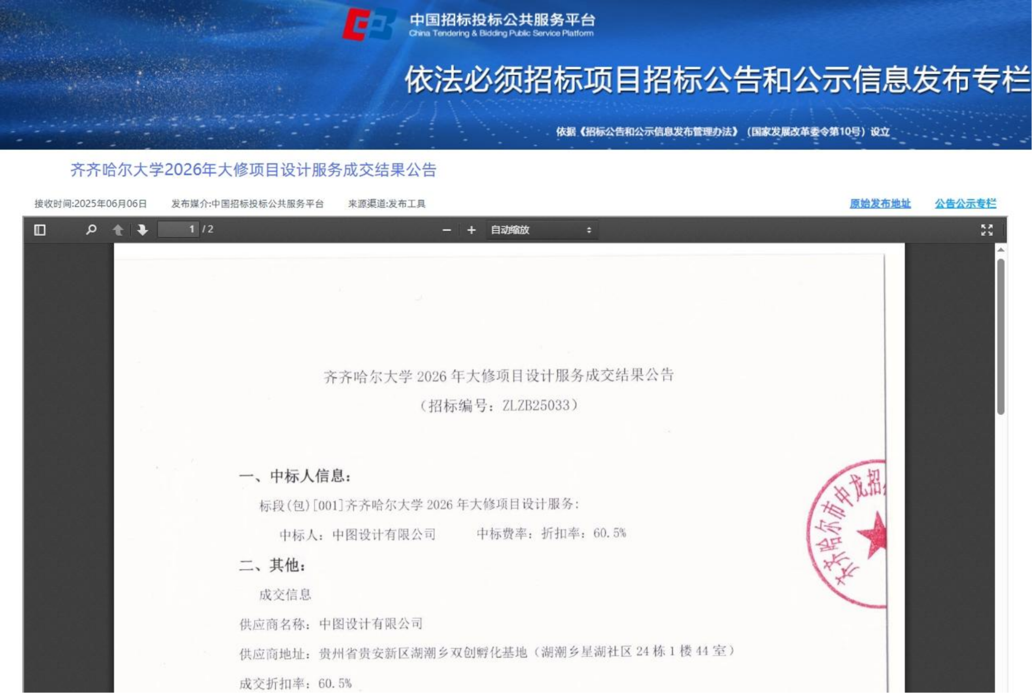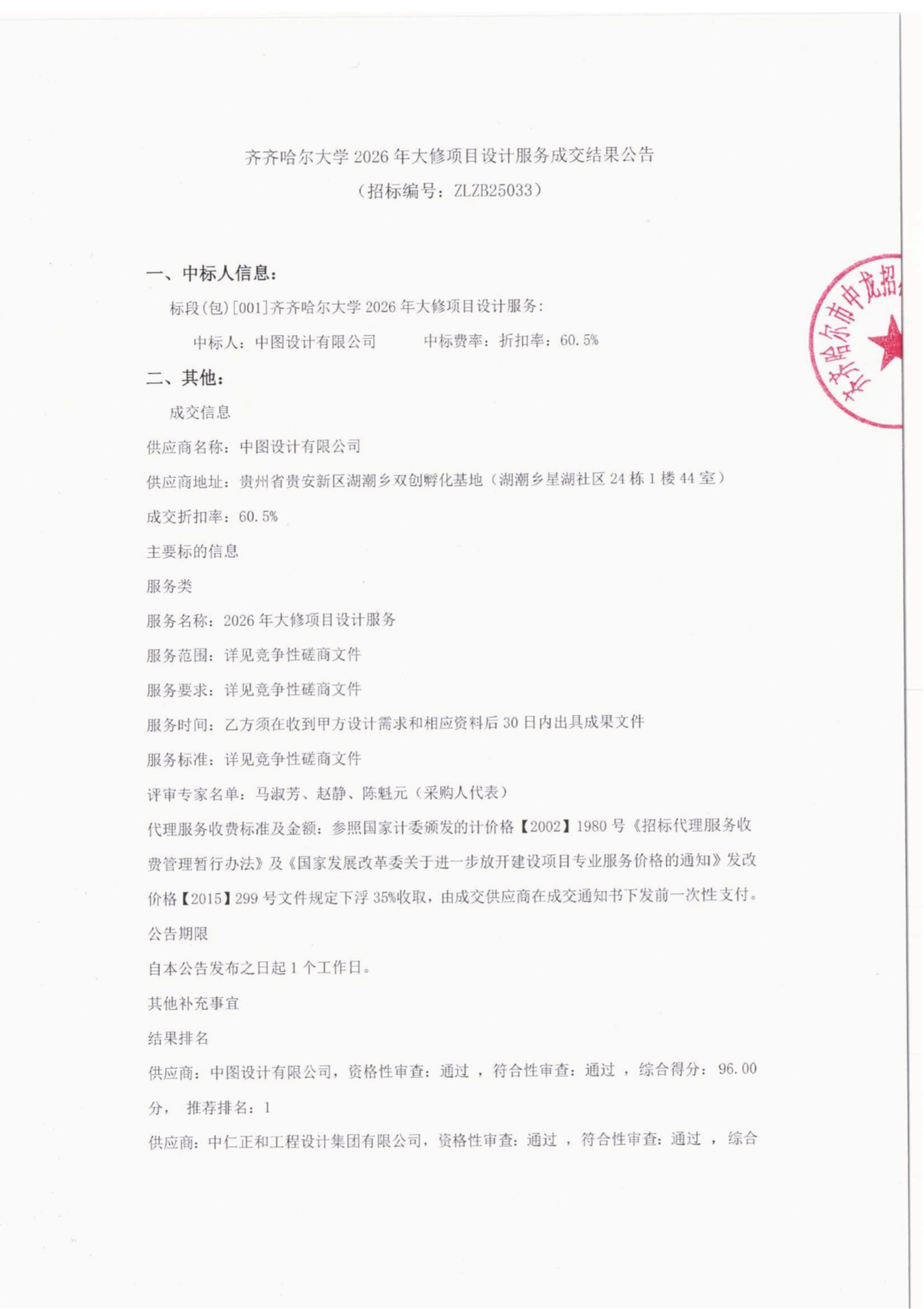 齊齊哈爾大學2026年大修項目設計服務成交結果公告(轉自中國招標投標公共服務平臺)