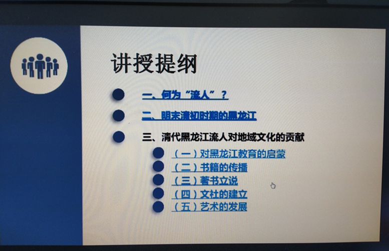 《索引鉤沉話“流人”——清代黑龍江流人對地域文化的貢獻》課程主要包含三個方面內容,一是流人的界定。二是明末清初時期的黑龍江。三是清代黑龍江流人對地域文化的貢獻。