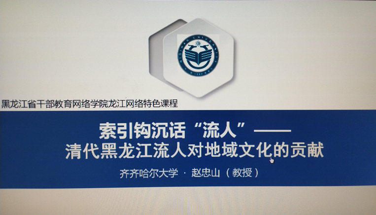 趙忠山教授旁征博引、索引鉤沉,從清代黑龍江流人對地域教育的啟蒙 、書籍的傳播、著書立說、文社的建立、藝術的發展、宗教信仰的改變等諸多方面進行了精彩的講授,課程講授生動流暢、圖文并茂、據經用典、精彩紛呈、體現了齊大學者的風范。課程深入淺出地闡述了黑龍江文化的淵源和流人啟蒙的重大意義,為黑龍江文化的研究具有重要參考與借鑒意義。正像課程結束語說的那樣:“黑龍江是滿清皇室龍興之地,滿清時期經濟文化相當落后,被稱之為蠻荒絕塞之地。這里居住著滿族、達斡爾、赫哲等眾多少數民族,他們對中原文化不了解,清代黑龍江文化流人的到來,傳播了中原文化與文明,啟蒙并推動了黑龍江地域文化的發展和繁榮!”