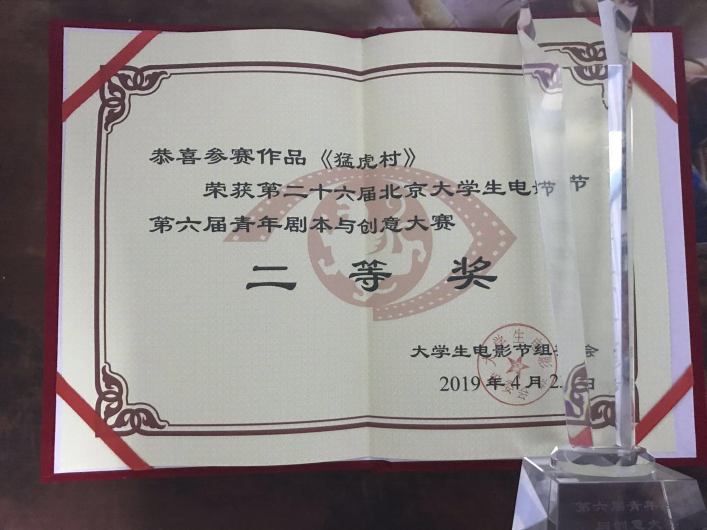 4月23日下午,第二十六屆北京大學生電影節第六屆青年劇本與創意大賽頒獎典禮在北京師范大學北國劇場舉行,我校文學與歷史文化學院戲劇影視文學專業162班朱泓江同學創作的劇本《猛虎村》脫穎而出,榮獲原創劇情類劇本二等獎。