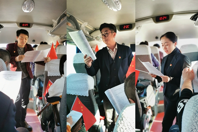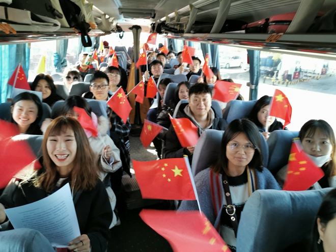 集中學習夯實理論底蘊。9月14日10:00,在齊齊哈爾開往鶴崗的大客車上,臨時黨支部組織師生黨員、入黨積極分子認真學習習近平總書記重要講話精神。臨時黨支部書記陳曦澤、副書記李美虹、宣傳委員鄧重博分別領學了習近平總書記在慶祝中華人民共和國成立70周年大會上、在國家勛章和國家榮譽稱號頒授儀式上、在慶祝中華人民共和國成立70周年招待會上的3篇重要講話。