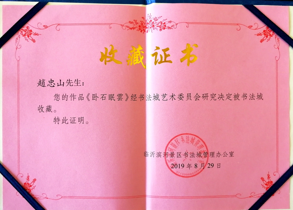10月28日,我校文學與歷史文化學院(新聞傳播學院)趙忠山教授的書法行書自作詩《臥石眠云》入選山東臨沂晉代著名書法家王羲之故鄉“中國書法城”書法展并撰刻碑藏。