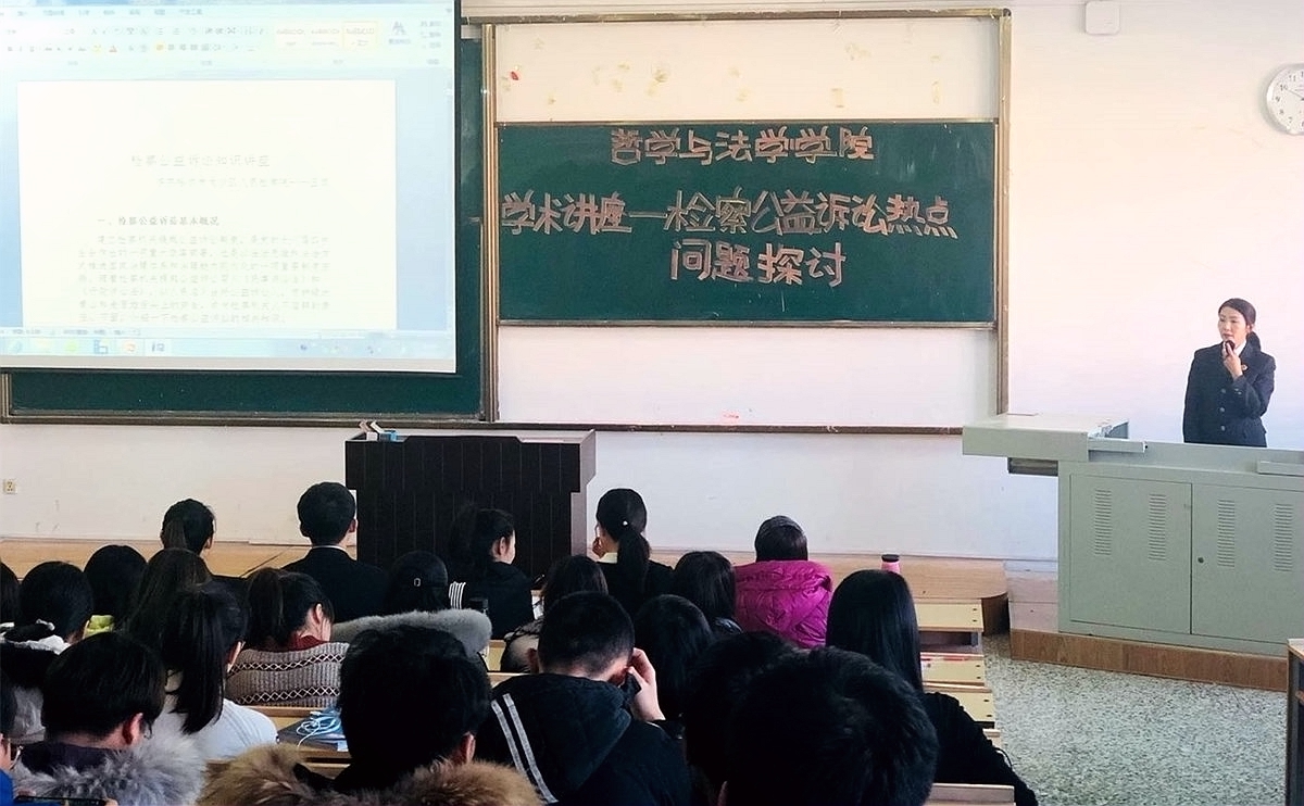 11月27日,學院邀請齊齊哈爾市龍沙區人民檢察院公益訴訟檢察部主任王麗做了題為“檢察公益訴訟熱點問題探討”的學術講座,使師生們加深了對公益訴訟制度的認識和了解,認識到公益訴訟對于維護國家和社會公共利益、規范行政行為、推進依法行政的重要意義。