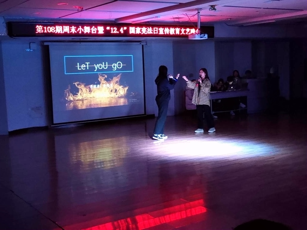 音樂與舞蹈學院在藝術樓四樓排練廳舉辦了第108期周末小舞臺歌手大賽暨“12·4”國家憲法日宣傳教育文藝晚會,以通俗易懂的語言將法律法規知識巧妙融入,增強了大學生的法治觀念。