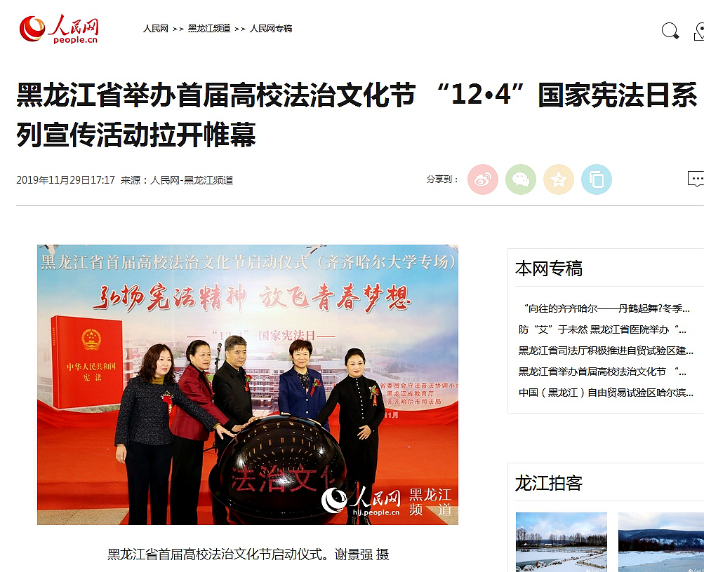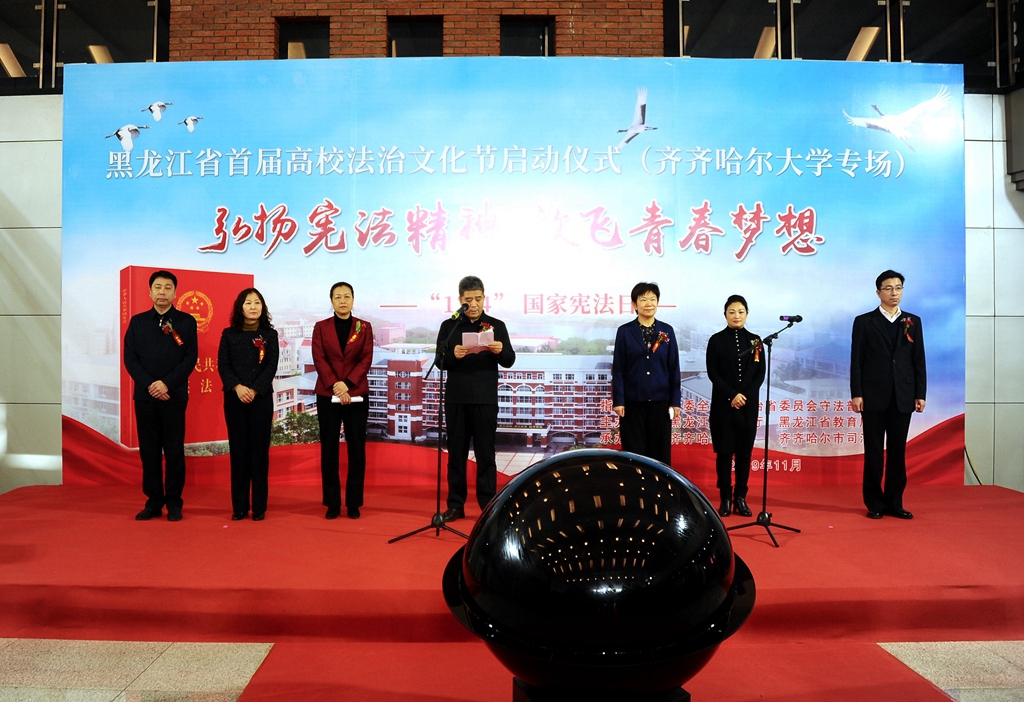 11月27日下午,由省司法廳、省教育廳主辦,齊齊哈爾大學、齊齊哈爾市司法局承辦的以“弘揚憲法精神 放飛青春夢想”為主題的黑龍江省首屆高校法治文化節(齊齊哈爾大學專場)在我校音樂廳隆重舉行,開啟了2019年全省國家憲法日系列宣傳活動。