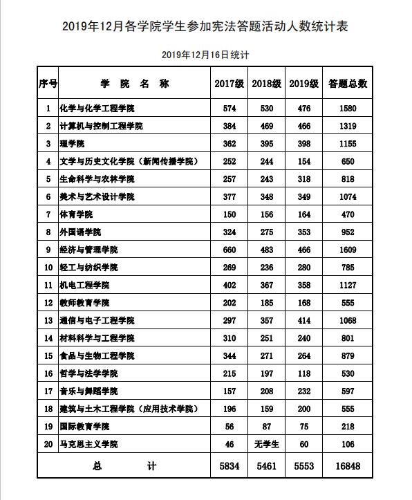 為深入推進“七五”普法工作,弘揚憲法精神,根據黑龍江省教育廳《關于組織在校大學生參與憲法答題活動的通知》要求,在第六個國家憲法日和第二個“憲法宣傳周”期間,我校組織學生參加了教育部“普法網”憲法答題活動。學校普法工作領導小組和各學院黨委高度重視,站在全面依法治國的政治高度,切實加強統籌領導。各學院黨委安排專人負責憲法答題活動,廣泛動員學生積極參加答題活動,參加答題學生數占應答題學生總數的91.37%,圓滿完成了答題工作。