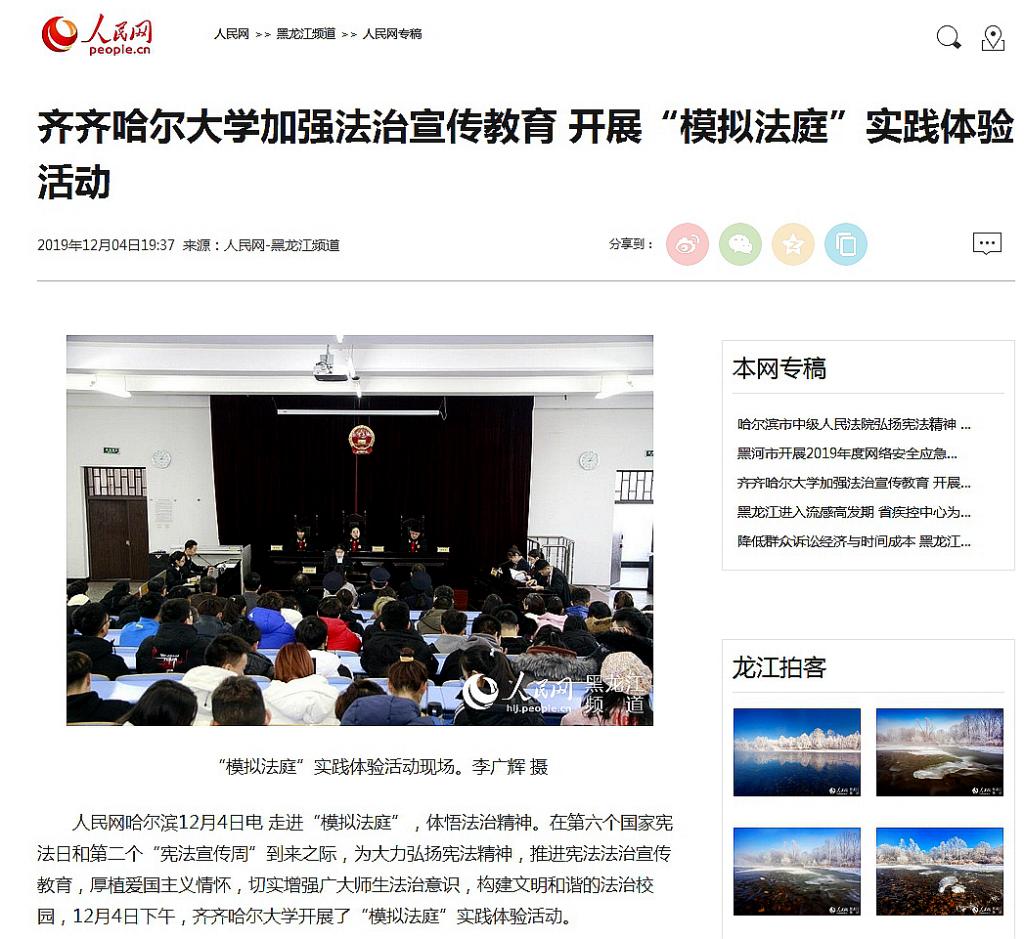 11月27日、12月4日,黨委宣傳部全體同志全程參加了黑龍江省首屆高校法治文化節活動,參加了“模擬法庭”實踐體驗活動,利用各區主樓、三致廣場電子屏等進行了廣泛的普法宣傳,在系列法治宣傳教育實踐中弘揚憲法精神,感受憲法力量。