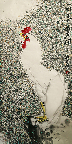 創作簡介:乙亥歲末,大疫滋生,庚子正月,蔓長不減,病疫不散,萬戶蕭疏,閉戶封窗,以斷病疫。今,斗柄回寅,萬物更新,百毒將袪。古亦有云,公雞者,克五毒,今借其意,以達眾望。長春以唐寅“一叫千門萬戶開”詩句,表達病毒盡去,萬戶皆開門敞窗,大快之情!