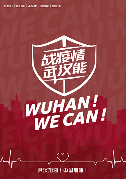 設計簡介:運用幾何圖形組成一個抽象的武漢字體為中心,畫面紋理設計有如戰場一般的視覺感受,紅和藍相融合的背景代表著火與雷電,寓意著戰勝疫情。